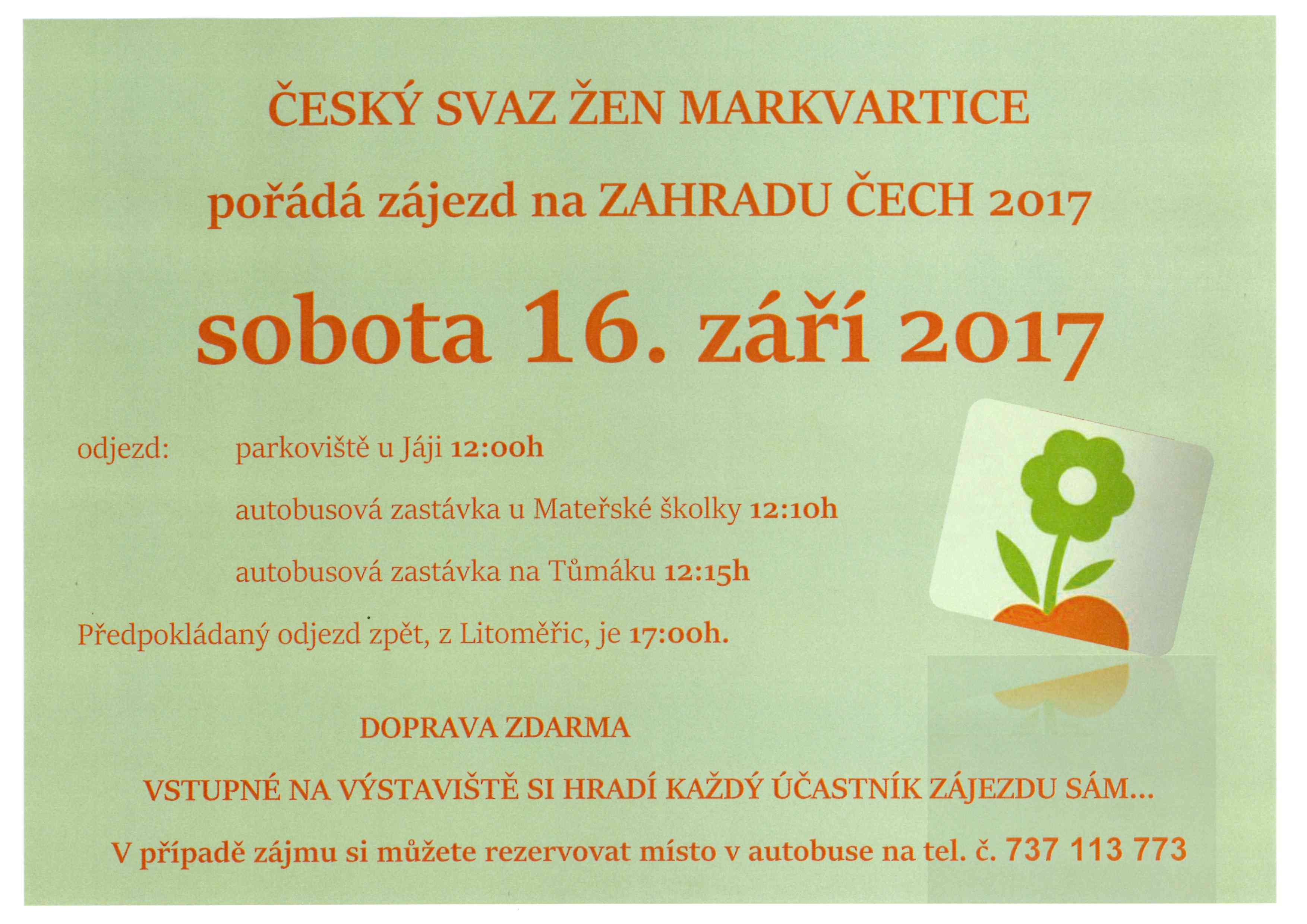 úterý, 12 září 2017 22:07 Pozvánka - ČESKÝ SVAZ ŽEN MARKVARTICE pořádá zájezd na ZAHRADU ČECH 2017 velikost písma zmenšit velikost písma zvětšit velikost písma Tisk Email Přečteno: 4009 x Naposledy změněno úterý, 12 září 2017 22:09 Tweet Zveřejněno v NOVINKY Stáhnout přílohy: 16_zari.jpg (1126 Stáhnutí) zpátky nahoru